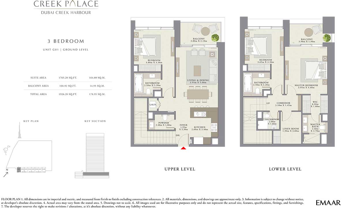 Планировка апартаментов с 3 спальнями в Creek Palace. Номер G01