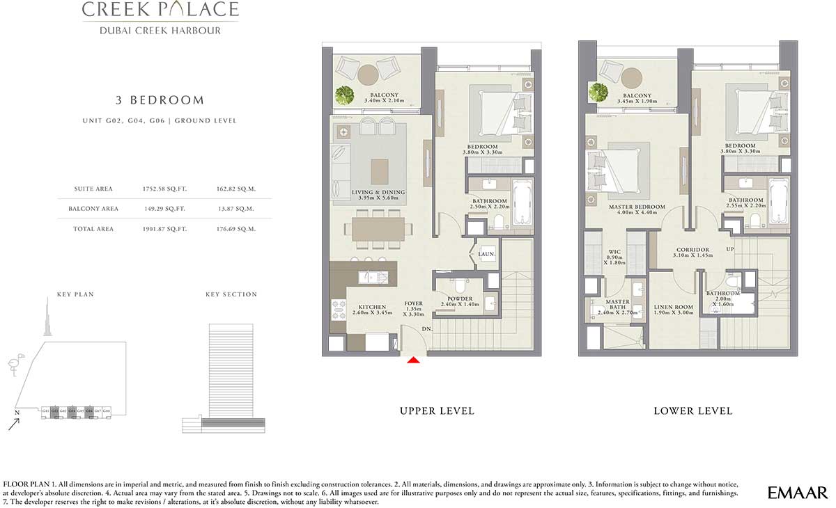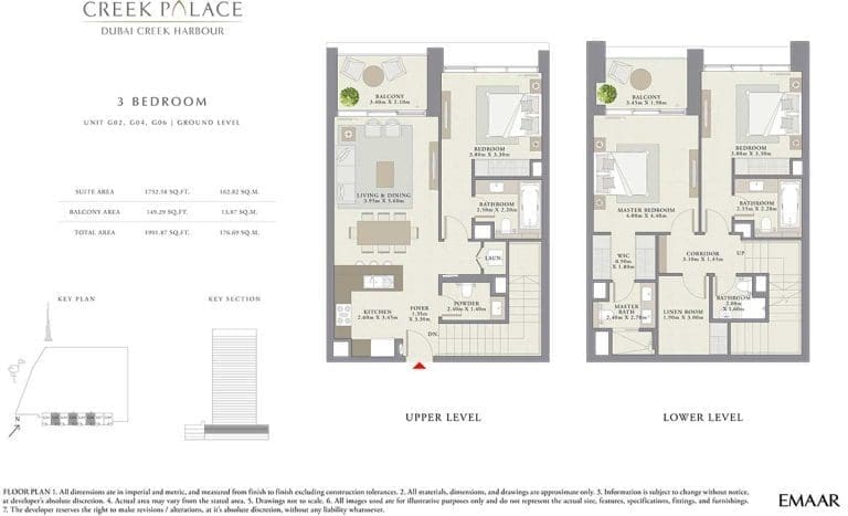 Планировка апартаментов с 3 спальнями в Creek Palace. Номер G02, G04, G06