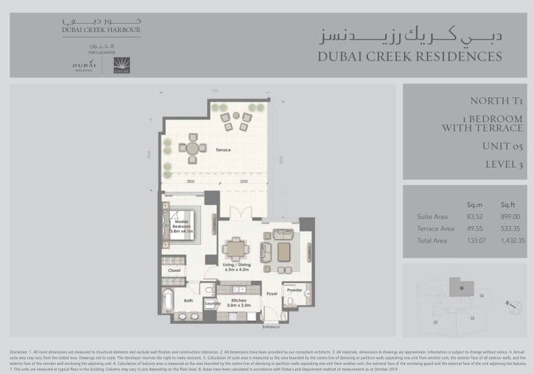 Планировка апартаментов с 1 спальней и террасой в Dubai Creek Residences. Тип North T1. Номер 05