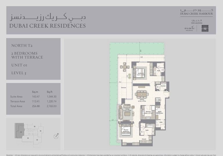 Планировка апартаментов с 2 спальнями и террасой в Dubai Creek Residences. Тип North T2