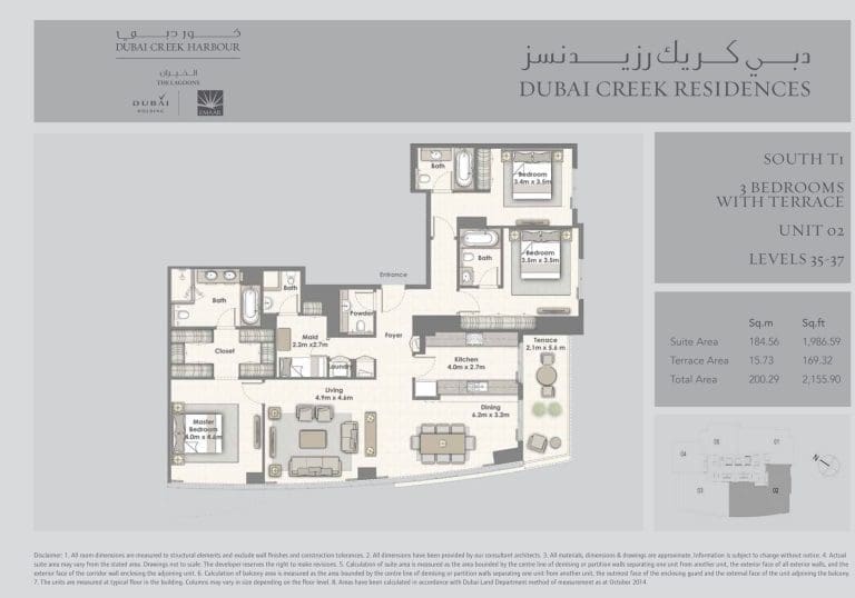 Планировка апартаментов с 3 спальнями и террасой в Dubai Creek Residences. Тип South T1