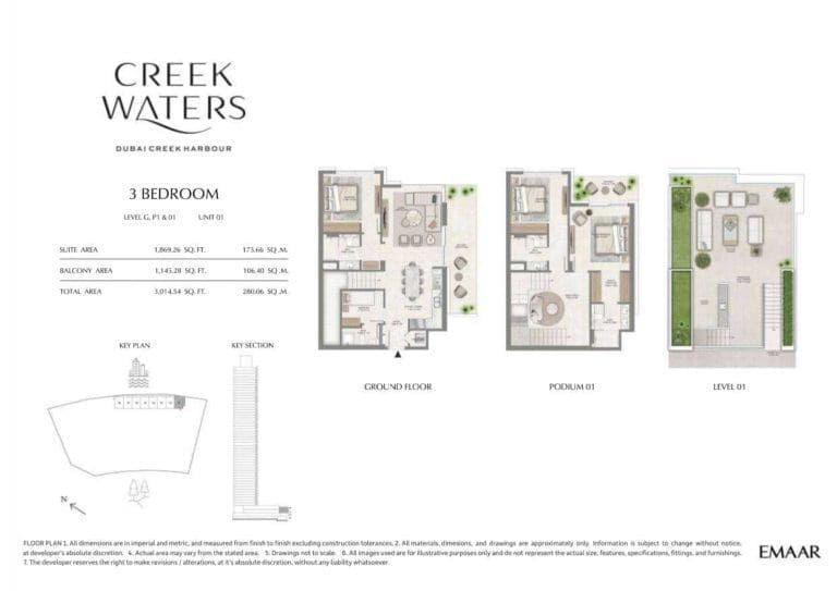 Планировка апартаментов с 3 спальнями в Emaar Creek Waters. Номер 01