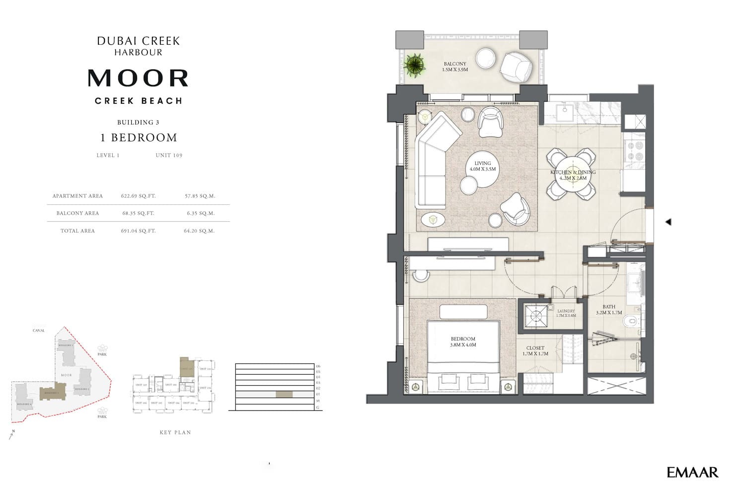 Планировка апартаментов с 1 спальней в Moor Creek Beach. Номер 109