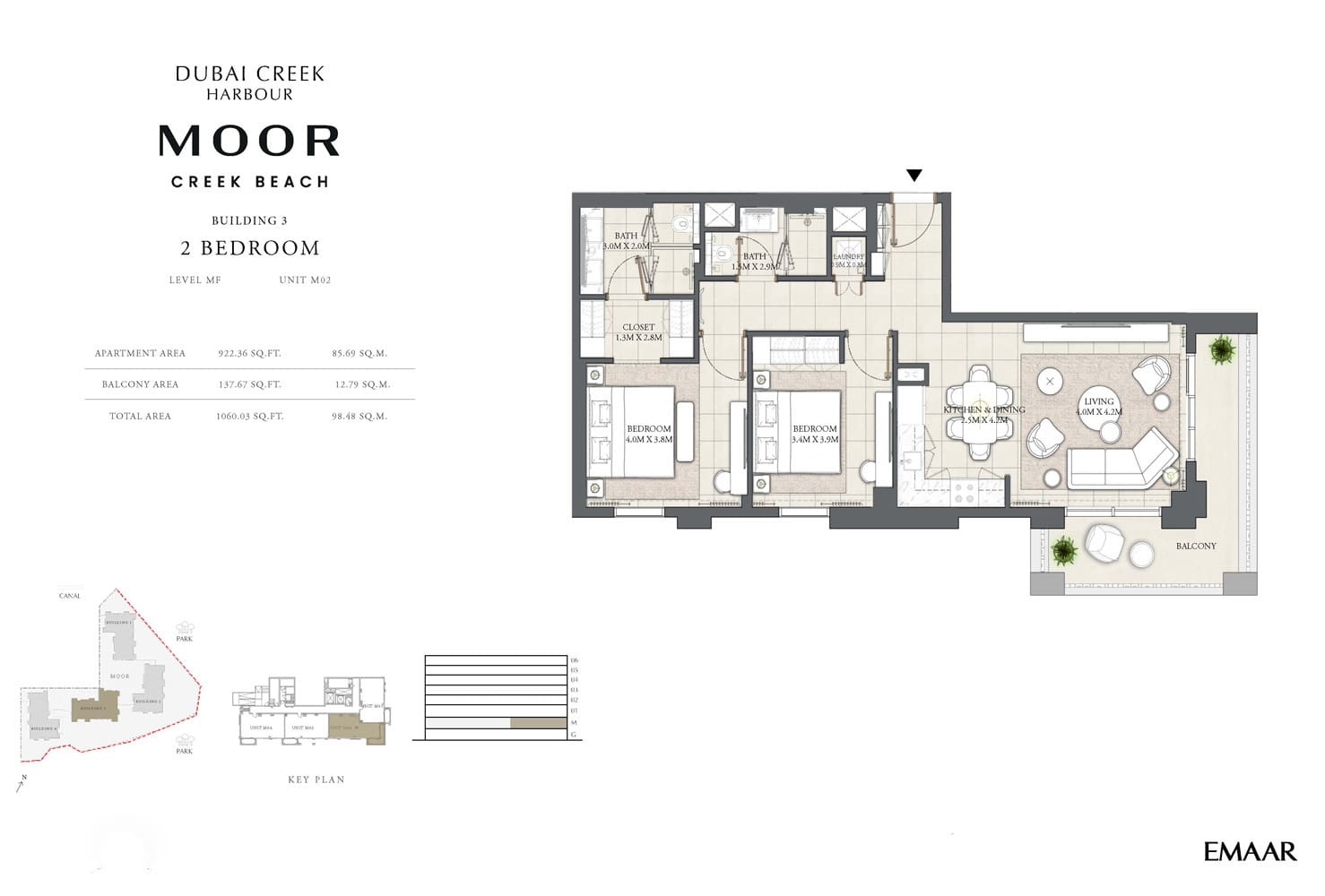 Планировка апартаментов с 2 спальнями в Moor Creek Beach. Номер M02