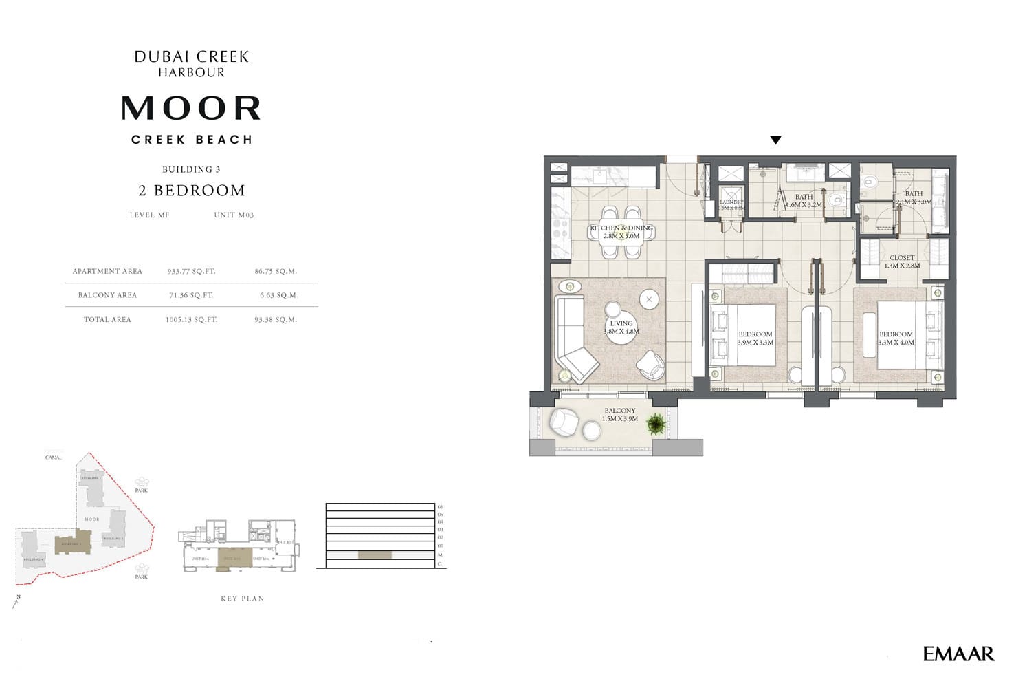 Планировка апартаментов с 2 спальнями в Moor Creek Beach. Номер M03