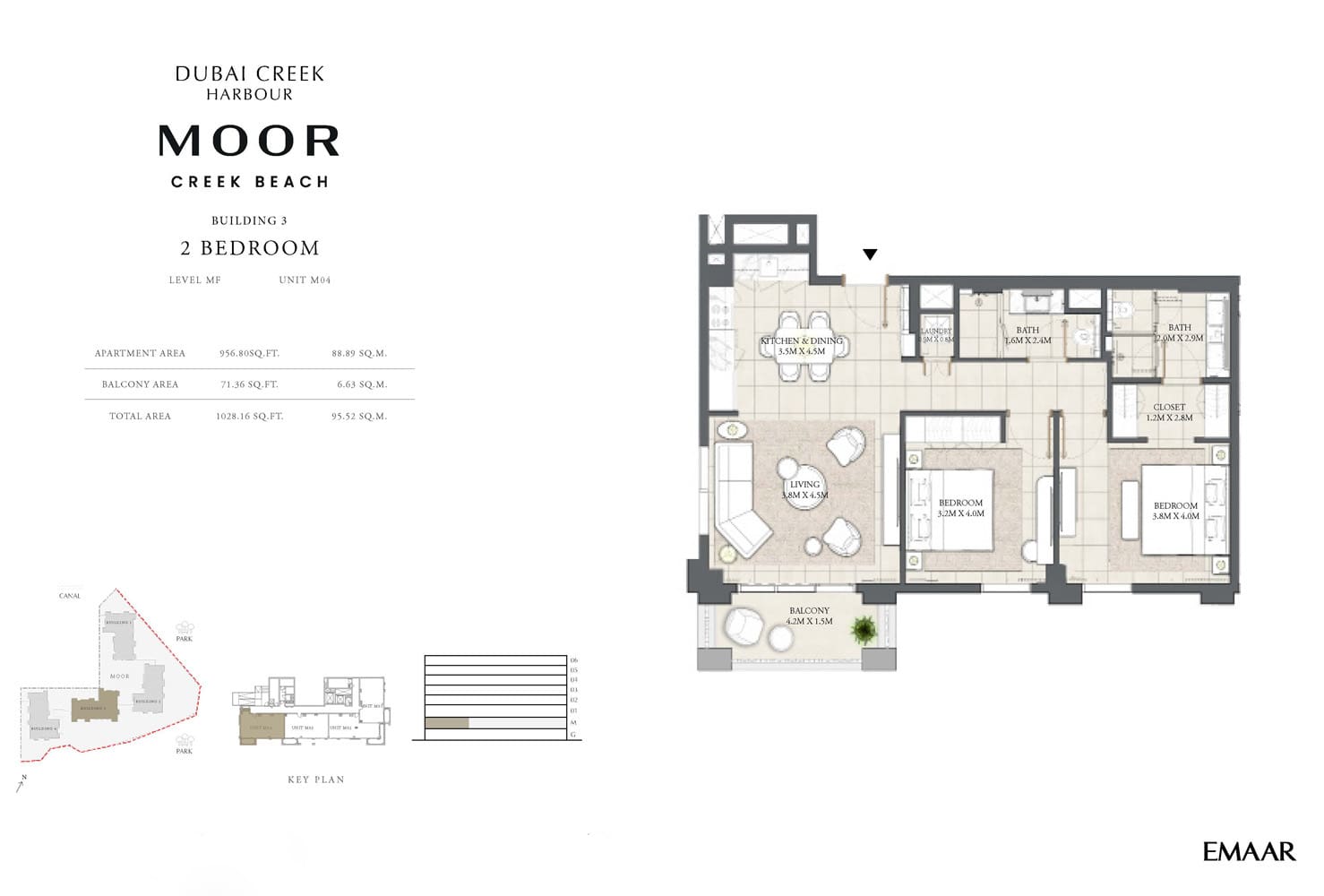 Планировка апартаментов с 2 спальнями в Moor Creek Beach. Номер M04