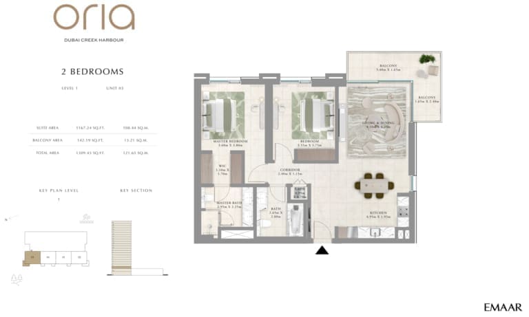 Планировка апартаментов с 2 спальнями в Oria by Emaar. Этаж 1. Номер 03