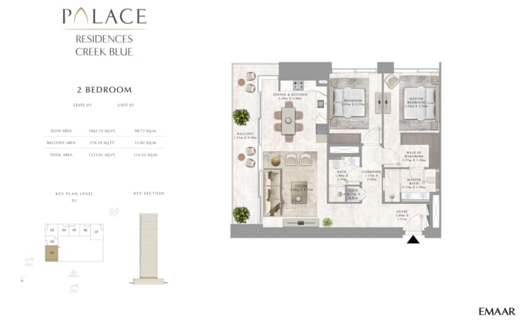 Планировка апартаментов с 2 спальнями в Palace Residences Creek Blue. Уровень 1. Номер 1
