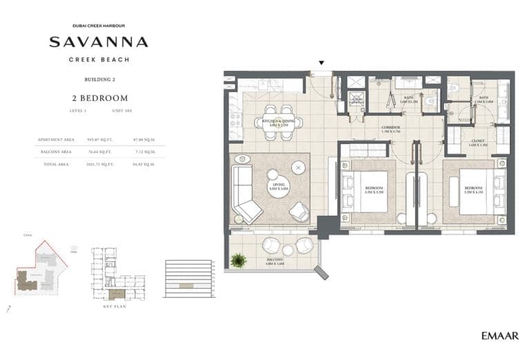 Планировка апартаментов с 2 спальнями в Savanna Building 2. Номер 103