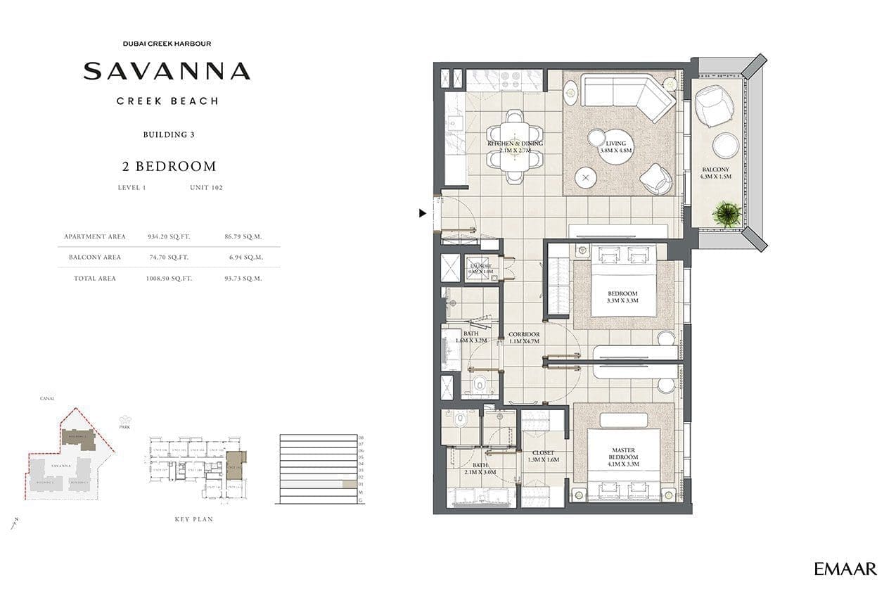 Планировка апартаментов с 2 спальнями в Savanna Building 3. Номер 102