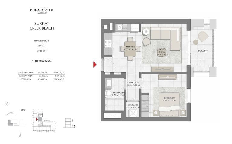 Планировка апартаментов с 1 спальней в Surf at Creek Beach 1. Номер 511