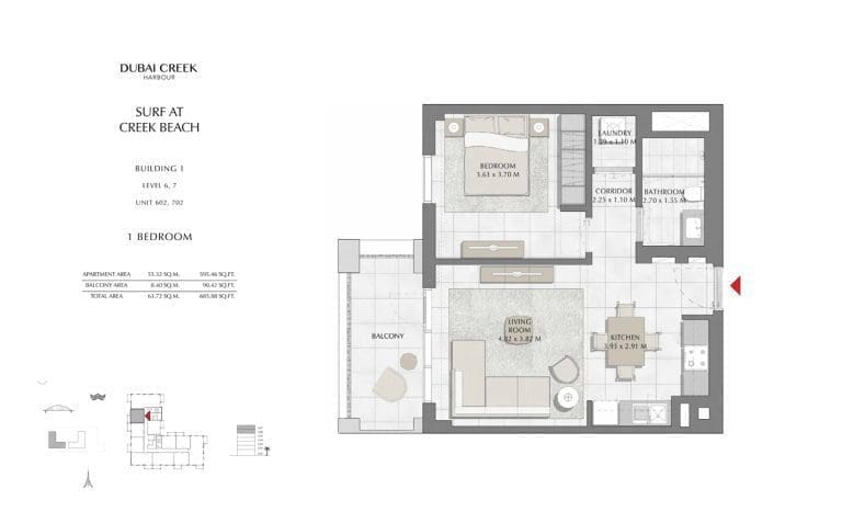 Планировка апартаментов с 1 спальней в Surf at Creek Beach 1. Номер 602