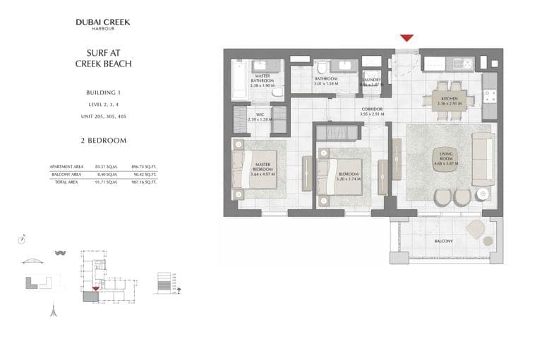 Планировка апартаментов с 2 спальнями в Surf at Creek Beach 1. Номер 205