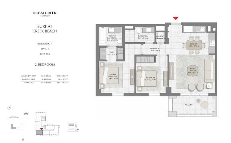 Планировка апартаментов с 2 спальнями в Surf at Creek Beach 1. Номер 505