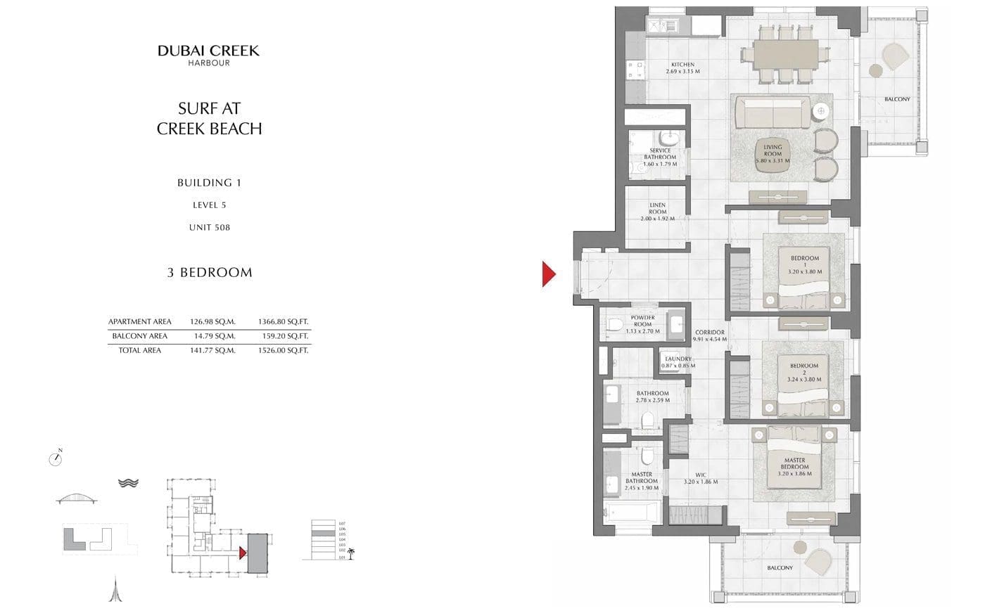 Планировка апартаментов с 3 спальнями в Surf at Creek Beach 1. Номер 508