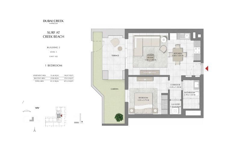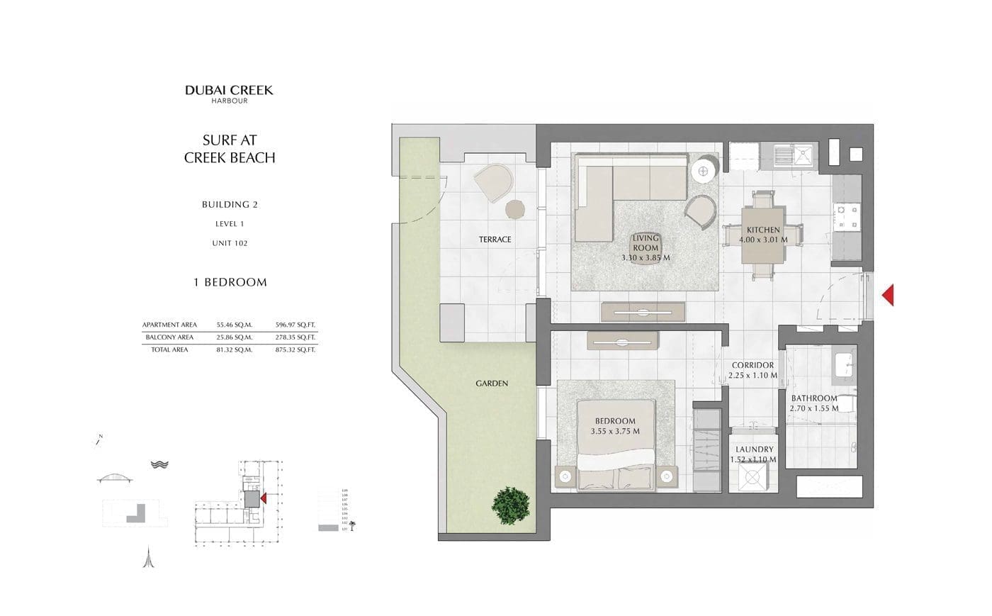 Планировка апартаментов с 1 спальней в Surf at Creek Beach 2. Номер 102