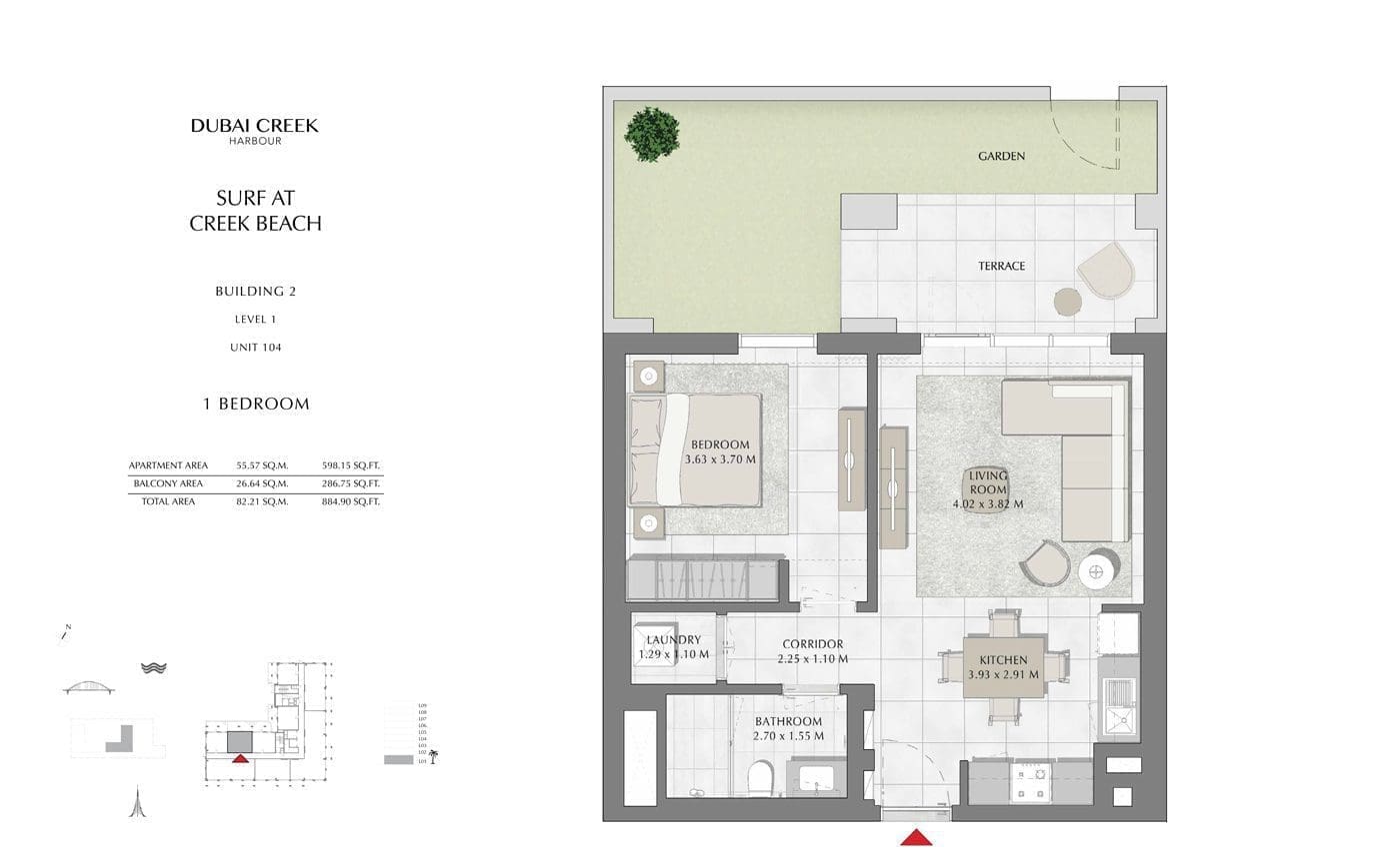 Планировка апартаментов с 1 спальней в Surf at Creek Beach 2. Номер 104