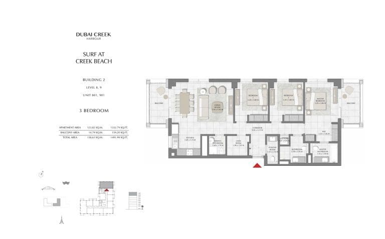 Планировка апартаментов с 3 спальнями в Surf at Creek Beach 2. Номер 801