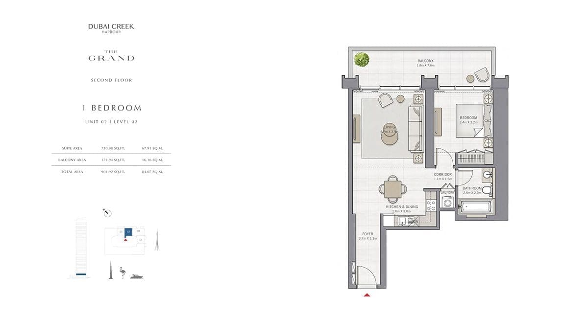 Планировка апартаментов с 1 спальней в The Grand в Dubai Creek Harbour. Номер 02