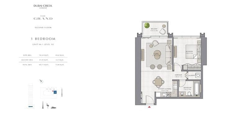Планировка апартаментов с 1 спальней в The Grand в Dubai Creek Harbour. Номер 04
