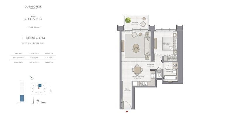 Планировка апартаментов с 1 спальней в The Grand в Dubai Creek Harbour. Номер 06
