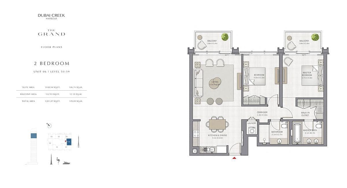 Планировка апартаментов с 2 спальнями в The Grand в Dubai Creek Harbour. Номер 06