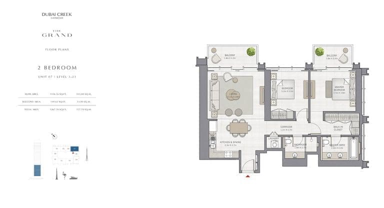 Планировка апартаментов с 2 спальнями в The Grand в Dubai Creek Harbour. Номер 07