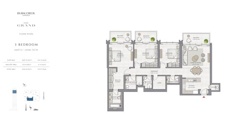 Планировка апартаментов с 3 спальнями в The Grand в Dubai Creek Harbour. Номер 01
