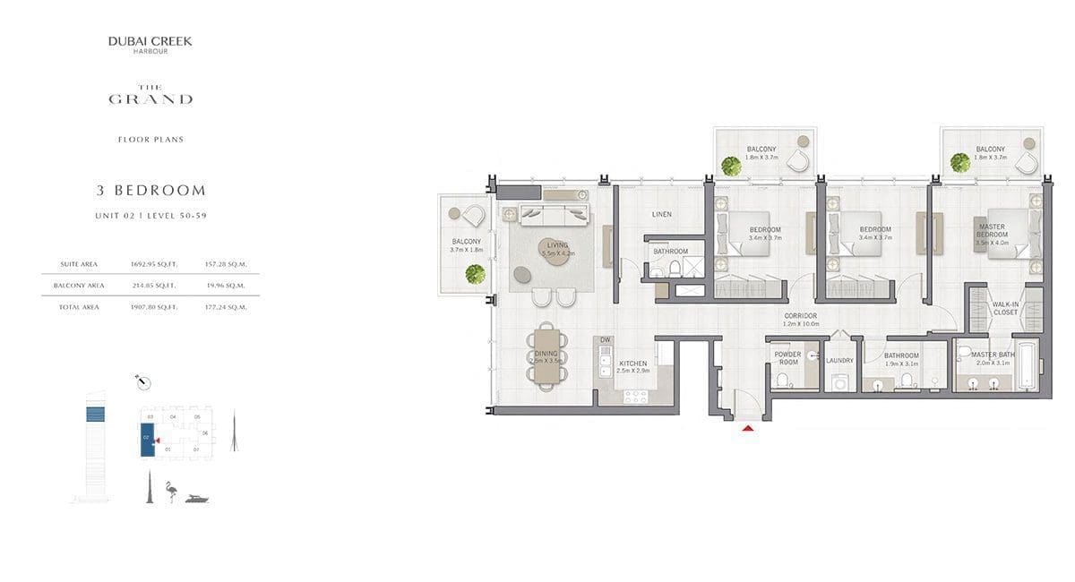 Планировка апартаментов с 3 спальнями в The Grand в Dubai Creek Harbour. Номер 02