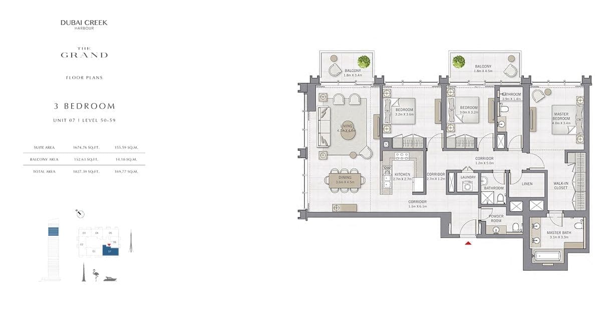 Планировка апартаментов с 3 спальнями в The Grand в Dubai Creek Harbour. Номер 07