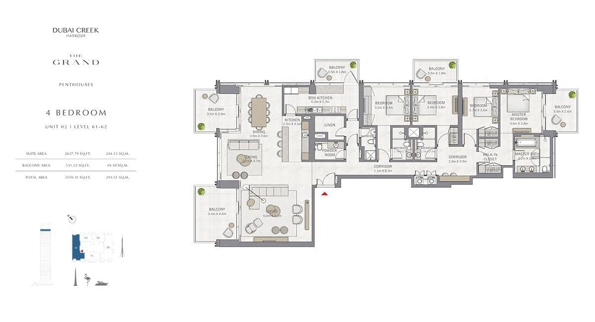 Планировка пентхауса с 4 спальнями в The Grand в Dubai Creek Harbour. Номер 02