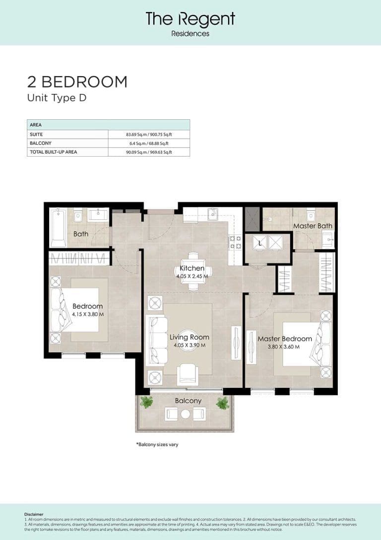 Планировка апартаментов с 2 спальнями в The Regent. Тип D